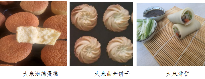 本项目利用稻米加工的副产物-碎米为只要原料,开发大米面包、大米曲奇、大米海绵蛋糕、大米蛋挞、大米薄饼等系列主食以及休闲米制食品。现有市场上的米制食品中,大米粉的添加量不超过10%,否则会对产品的品质产生负面影响,比如大米面包起发性差,体积小;大米曲奇和大米蛋糕口感粗糙,吞咽困难等。因此,本项目采用了生物酶制剂改良、复合调理等技术,使得大米粉的添加量达到30%以上,这样减少了产品中面粉的用量,增加米粉的用量,大大降低了麸质的含量,并且碎米为原材料,极大地降低了成本。制备得到的大米面包和曲奇饼干具有浓郁的米香,大米蛋挞的保质期优于市场产品。