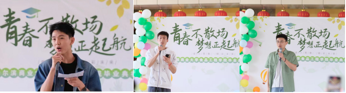 毕业生代表王华锋、姜好玉、杨海鹏三位同学分别在主持词中和发言中表达了对学校的培育、学院的栽培、各位老师的培养、辅导员日常关爱的感激之情,以及对同学们的不舍。