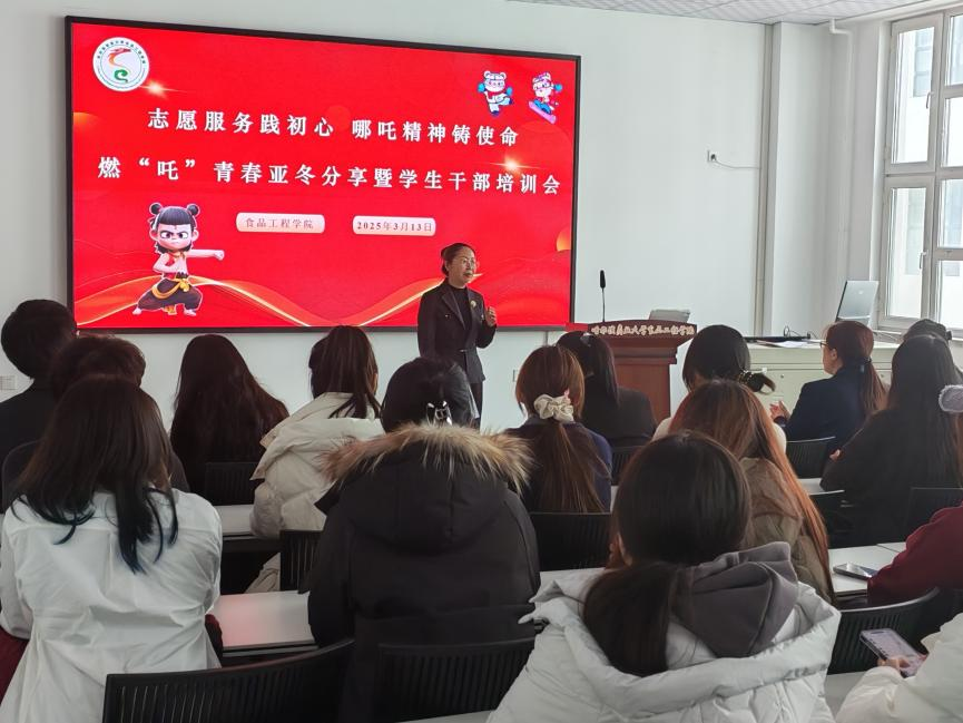第九届亚洲冬季运动会于2025年2月7日至2月14日在哈尔滨举行,是继2022年北京冬奥会后中国举办的又一重大国际综合性冰雪盛会。哈尔滨商业大学食品工程学院积极响应号召,食品工程学院院长张娜受邀为亚冬会食品安全专家组成员,与两名教师及8名学生志愿者积极投身到服务亚冬的热潮中,在亚洲冰雪盛事中展现学院风采。为此食品工程学院于2025年3月13日开展“志愿服务践初心,哪吒精神铸使命”——燃“吒”青春亚冬分享暨学生干部培训会,共同聆听志愿者们的心声与收获。食品工程学院党委副书记石亚平、副处级辅导员贺殷媛、团委书记李慧铭、团委副书记岳鸿超、张玥,辅导员王金荣,以及院级学生组织的50名学生干部参加此次会议,食品工程学院学生会执行主席冯冰清主持会议。
