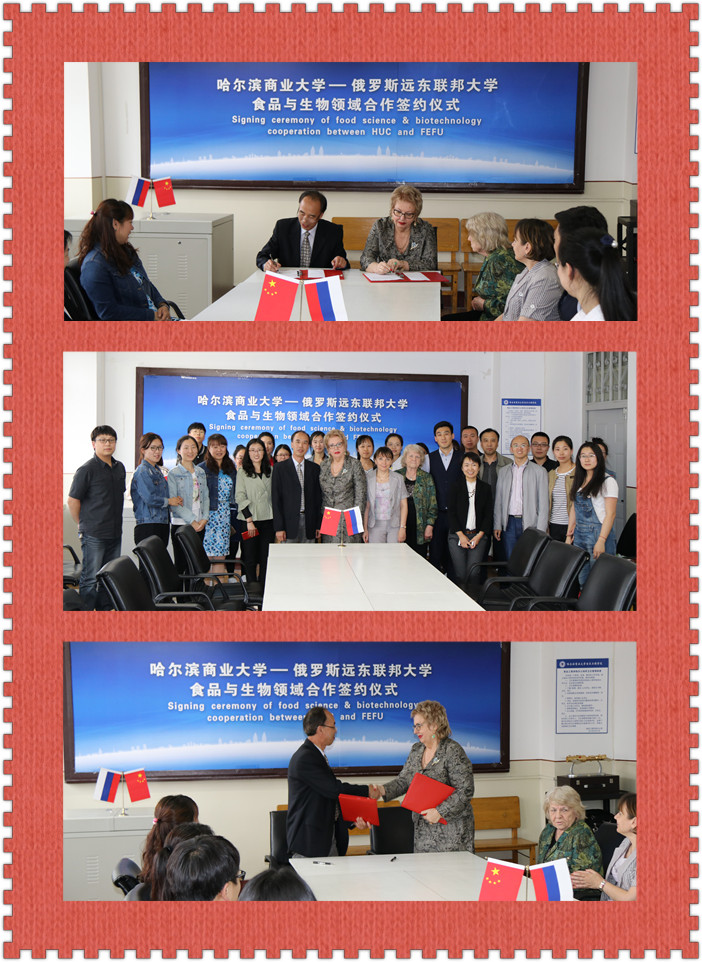 品鉴会结束后,石彦国院长代表食品工程学院与俄罗斯远东联邦大学生物医学学院卡列尼克教授签署了寒 地食品资源中生物活性物质的开发与利用框架合作协议。在该协议下,两校将加强学生培养交流,教师互派学习、重点实验室建设以及科研合作交流方面达成了初步的意向。