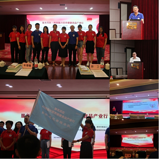 6月21日上午,“服务苏区·科技振兴营养健康食品产业行”启动仪式在赣县新饭店三楼会议室举行。中国工程院院士朱蓓薇、陈卫,中国工程院三局副局长黄海涛,赣州市领导蓝赟,赣县区人民政府副区长乔健,各大高校的老师和志愿者等出席了启动仪式。陈卫院士代表本次志愿者致辞,致辞中他阐明了赣州的地理、人文以及在党的发展中的重要性,在简要介绍了服务苏区的志愿活动后,他指出,本次志愿服务苏区活动不仅是食品安全知识科普、弘扬党的百年光辉历程,更是培育广大师生、志愿者良好的社会责任感和使命感的实践机会。乔健副区长对本次志愿者行动提出希望,希望志愿者们可以在苏区学史悟史展望未来;希望志愿者们可以用科学技术给苏区带来产业振兴;希望志愿者们把科普行动和社会责任意识结合起来。致辞结束后,朱蓓薇院士向本次志愿者代表授旗,张娜副院长作为服务苏区科技志愿者代表上台宣誓,秉承“坚定信念、求真务实、艰苦奋斗、争创一流、无私奉献”的苏区精神,加强食品科技攻关和食品科学普及,以高效服务和务实精神创新建功,为建党百年献礼,启动仪式圆满结束。志愿者们接下来聆听了中国疾控中心营养与健康研究所孙静研究院带来的科普大讲堂“儿童营养与营养改善”。