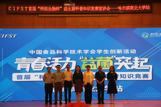 中国食品科学技术学会首届“科拓生物杯”益生菌科普知识竞赛宣讲会于2021年6月30日下午在哈尔滨商业大学专家公寓国际报告厅隆重召开。出席会议的嘉宾有,科拓生物市场品牌运营总经理宫霄九、科拓生物研发总监王记成、山西大学生命科学学院副教授张国华、中国食品科学技术学会工程师朱运恒、哈尔滨商业大学食品工程学院党委书记王诤、哈尔滨商业大学食品工程学院院长马永强、哈尔滨商业大学食品工程学院副院长张娜,以及200余名学生代表参加本次会议。