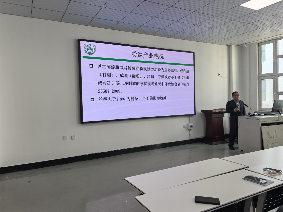 程永强教授从粉条产业概况、粉条用淀粉不同加工方式对比、高抗性淀粉粉条制造、粉条装备的改造思考等四个方面,系统介绍了高抗性淀粉粉条的加工与装备领域前沿进展。深入剖析传统粉条加工技术创新传承与应用的关键点与科学价值。会上,我院师生与程教授在新技术赋能背景下传统食品加工面临的挑战与机遇方面开展了热烈的讨论。
