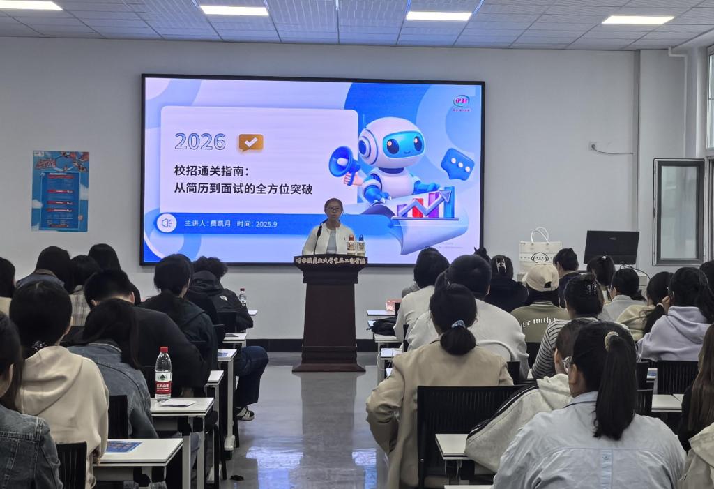 为助力食品工程学院学子提升就业竞争力,精准对接职场需求,2025年9月24日,哈尔滨商业大学食品工程学院特邀伊利集团酸奶事业部东北营销总部哈尔滨区域人事行政负责人费凯月,在东实验楼324室开展题为“从简历到面试的全方位突破”的就业指导讲座,讲座由院团委书记李慧铭主持。