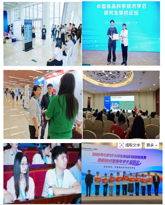 作为食品领域的年度盛会,本届年会围绕AI与食品工业、新质蛋白、合成生物学、乳品深加工等前沿热点,设置了近50场活动,300余位专家带来深度学术报告,收录近800篇论文摘要,为参会者搭建了全方位的学习交流平台。院士专家们在大会报告中前瞻行业趋势,从AI重构饮食生态到微生物资源开发,从柑橘加工技术革新到碳中和与产业变革,为食品科技发展指明方向。同时,年会还举办了科学技术奖颁奖、学生创新竞赛表彰、研究生学术论坛、名企专场招聘会等活动,强化科技与产业融合,助力青年人才成长。我院师生积极参与各项学术研讨与交流活动,近距离汲取行业智慧,为后续科研与创新积累宝贵经验。
